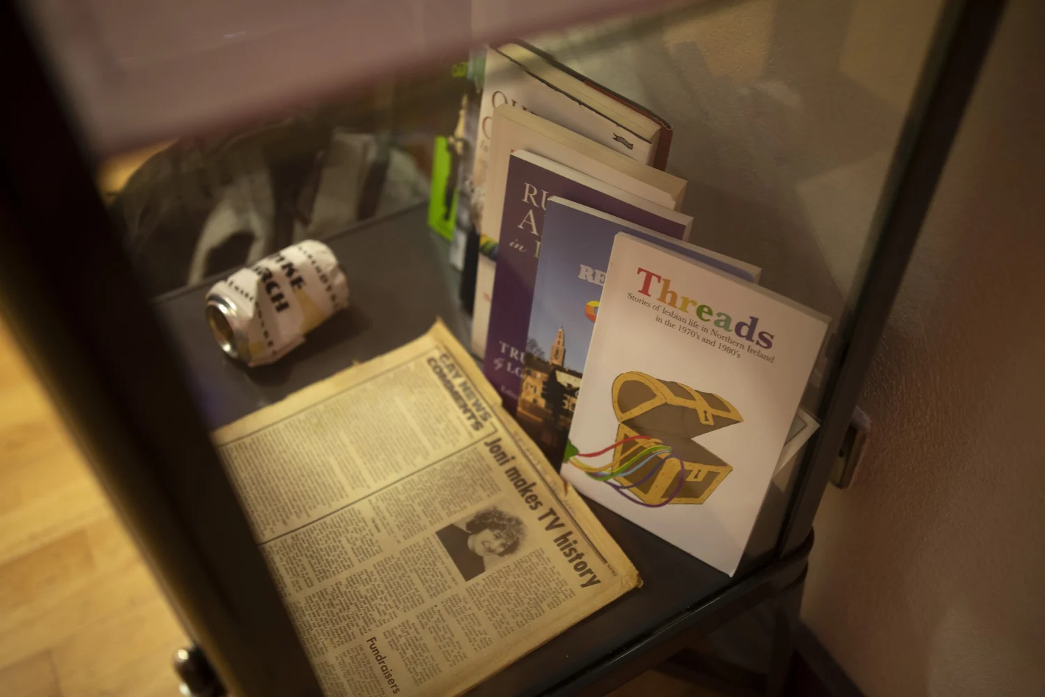 The exhibition included an audio soundscape composed by Cara Holmes from speeches made at the 40th anniversary of Dublin Lesbian Line, the film Tribe by Alisha Doody, a cabinet of ephemera gathered through an open call, a banner from the Running Amach social group and 6 display panels: